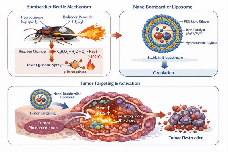 放屁甲虫(Brachinus spp.)简直是昆虫界的化学战专家——它能在屁股里精准调控一场爆炸性反应:对苯二酚和过氧化氢在它体内狭路相逢,瞬间生成高温、毒气(对苯醌)和氧气,喷出一股烫手的化学烟雾弹,堪称自然界毫米级军工复合体。受这种“活体微型反应器”的启发——顺便也致敬一下童书《我的100个小问题》里那个“虫子为什么会放屁”的灵魂拷问——我们捣鼓出了一种肿瘤靶向的脂质体纳米反应器。这玩意儿就像个伪装成快递的卧底特工:在血液里溜达时人畜无害,一旦溜进酸性强、过氧化氢爆表的肿瘤微环境,立马开启“烧烤+下毒”双重模式,局部放热、产生活性氧和醌类物质,把肿瘤细胞搞得又烧脑又中毒,顺便诱导它们凋亡和铁死亡——两种死法打包带走。关键是,这套“化学暗器”对全身其他部位没啥误伤。大自然搞出来的防御性燃烧,到了纳米医学手里,就变成了精准治疗的骚操作。