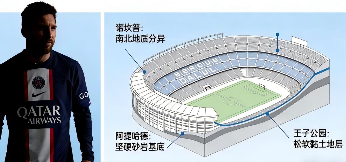 (3)巴黎王子公园球场下方松软的第四系及古近纪沉积地层,与诺坎普南看台地质特征高度一致,可能增强梅西的场地适应性;