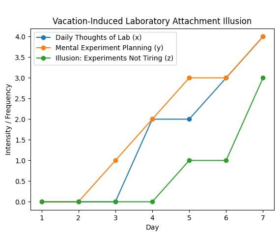 图1为长期放假期间「实验室依附错觉」之动态变化,其中横轴为天数(Day1-7),纵轴为各指标之强度或出现频率。蓝线(x)代表每日主动想起实验室之次数;橘线(y)代表是否于脑中规划实验流程(即使无实际需求);绿线(z)代表是否产生「其实做实验也没那么累」之错误认知。