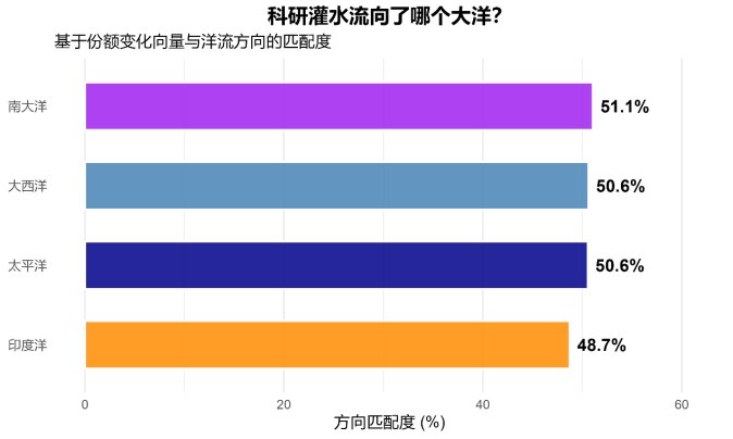 本文通过计算论文份额变化并将其映射到地理空间,构建了全球科研影响力的漂移向量,并与海洋洋流方向进行了比较。结果表明,科研漂移方向在统计上与多个洋流方向具有约 50% 的匹配度,其中南大洋略高。