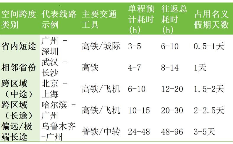 | 空间跨度 | 代表线路 | 主要交通工具 | 单程预计耗时(h) | 往返总耗时(h) | 占用名义假期天数 |